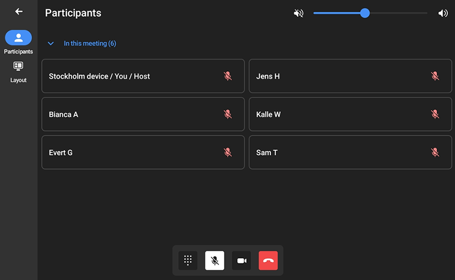 View of participants and conference controls on the touch panel during a gateway meeting.