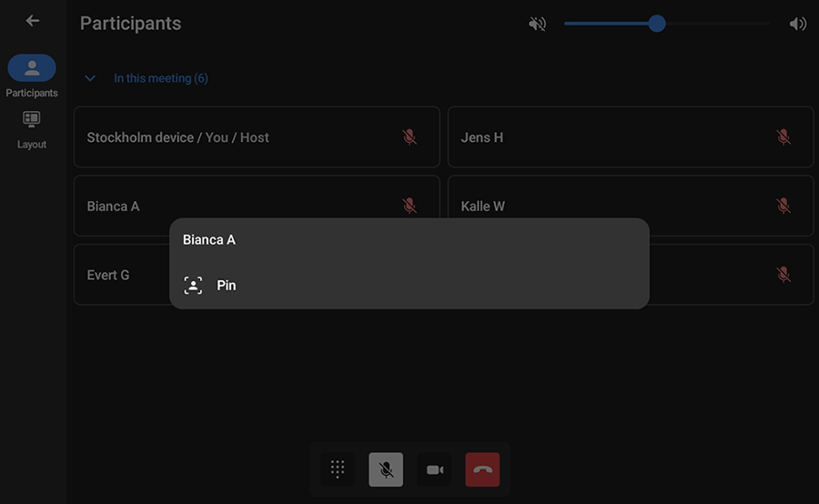 View of the Pin participant control on the touch panel during a gateway meeting.