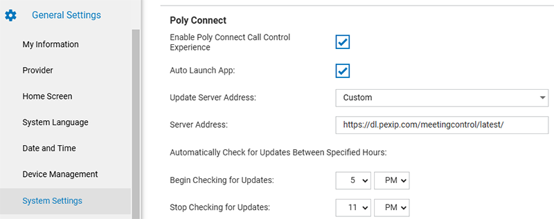 - Choose an Update Server Address, the URL where an endpoint can check for a new version of the Meeting Control App. Default: Poly Lens. If you want to receive updates directly from Pexip when they become available, change this to Custom and enter https://dl.pexip.com/meetingcontrol/latest/ as the server address.