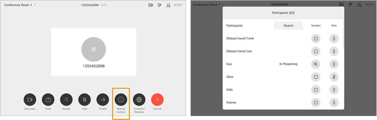 1. In the participant view on the Cisco endpoint, the mute status icon does not currently reflect the server-side mute status like it does in Microsoft Teams conferences. This means that on the Cisco endpoint in Google Meet conferences, participants always appear as unmuted even if they are muted on the server side.
