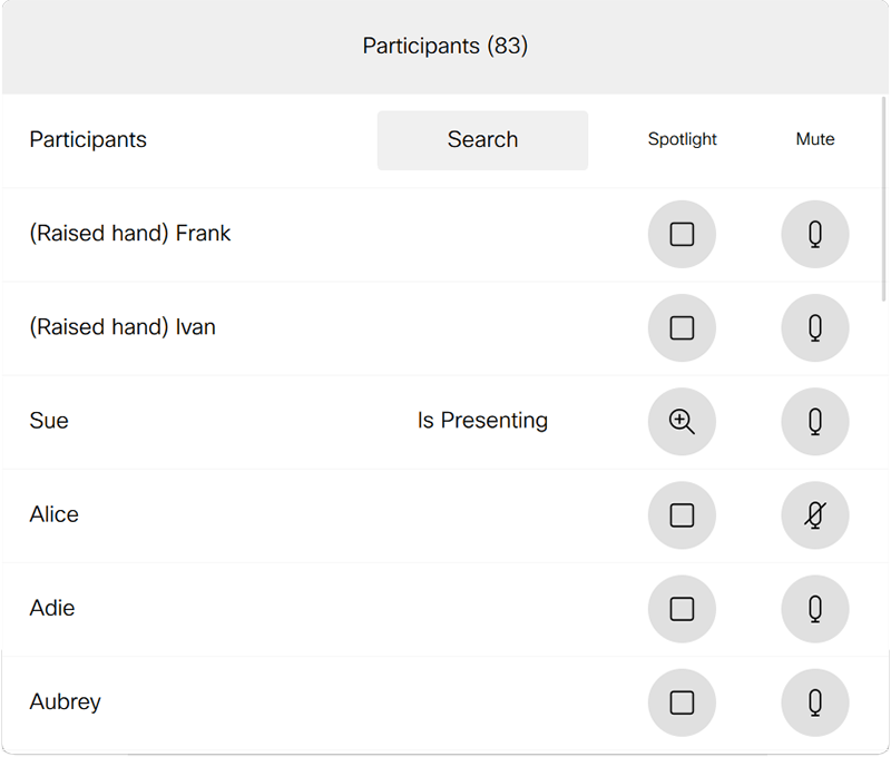 • view the full participants list — sorted by raised hand time, then spotlight status, then time joined