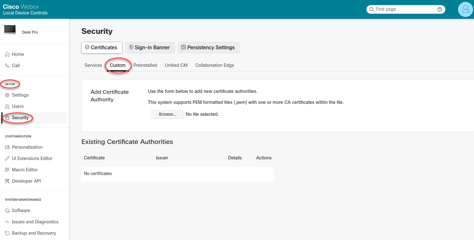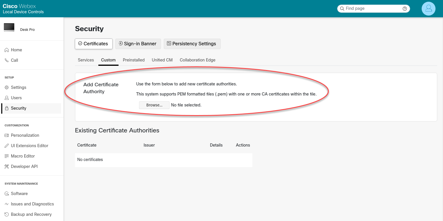 • If the Cisco endpoint has not already been provisioned by the Pexip Service, it requires the ISRG Root X1 certificate to be added manually as a Custom CA. Instructions on how to do this are in Troubleshooting.