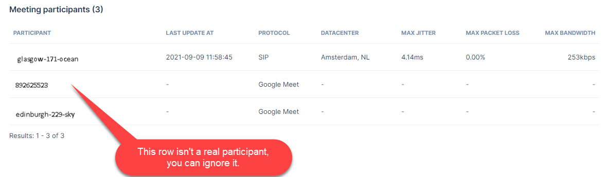 Note that for Google Meet meetings, after selecting a gateway connection, in addition to the participants you see an extra row with a numeric string in place of the participant video address. It is not a real participant, you can just ignore this row.