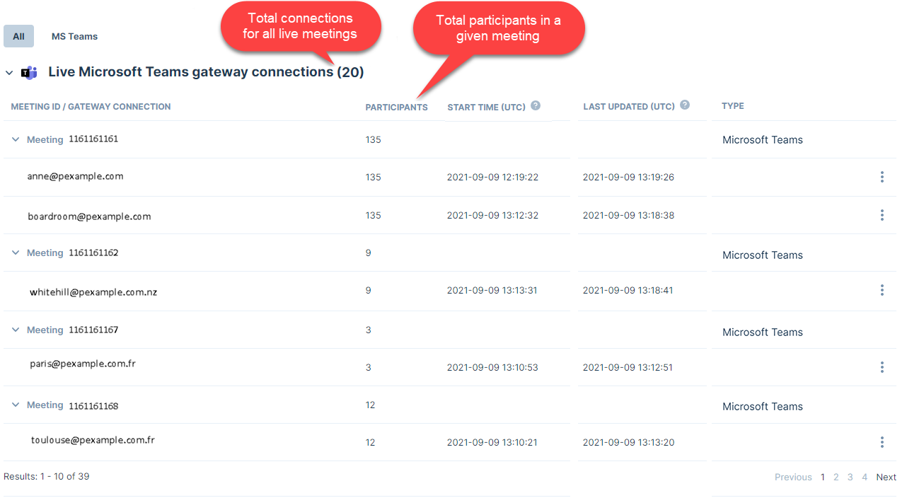 - The display is grouped into separate sections for Pexip, Microsoft Teams and Google Meet meetings.
