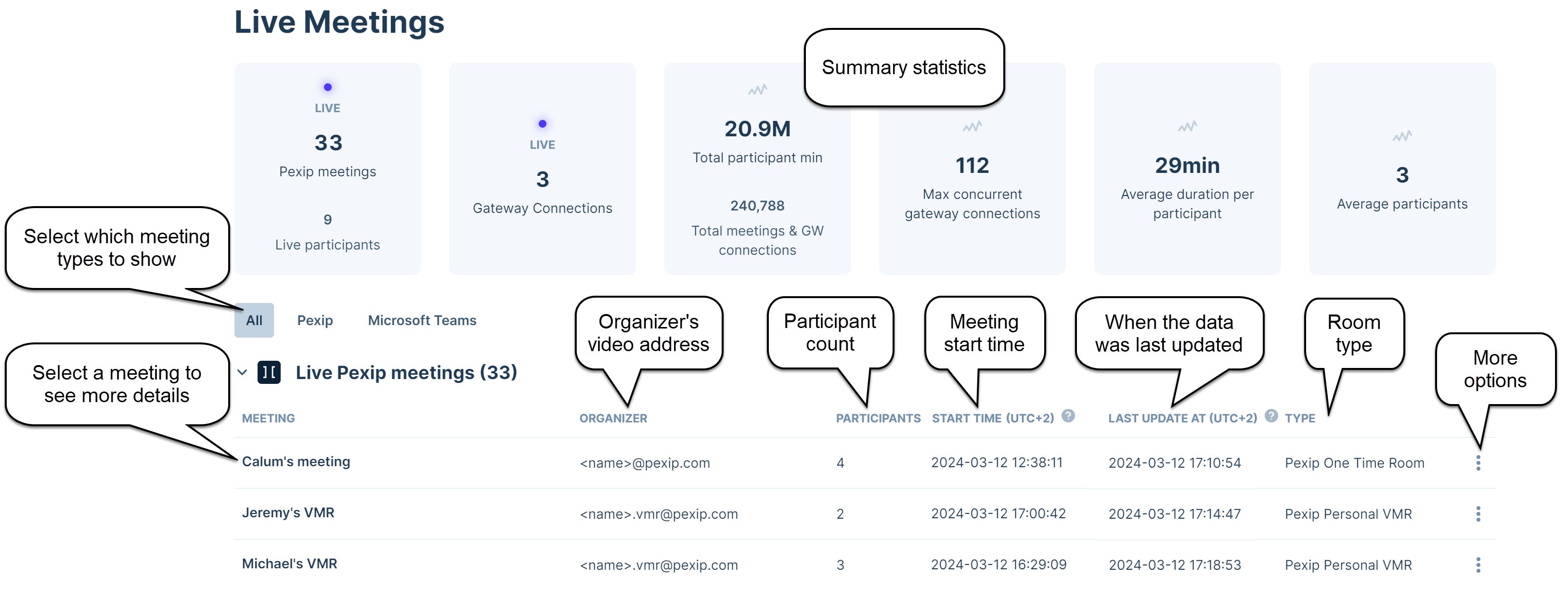 The live Pexip meetings table shows the information below. Just click on an item in the Meeting column to go into a specific meeting.