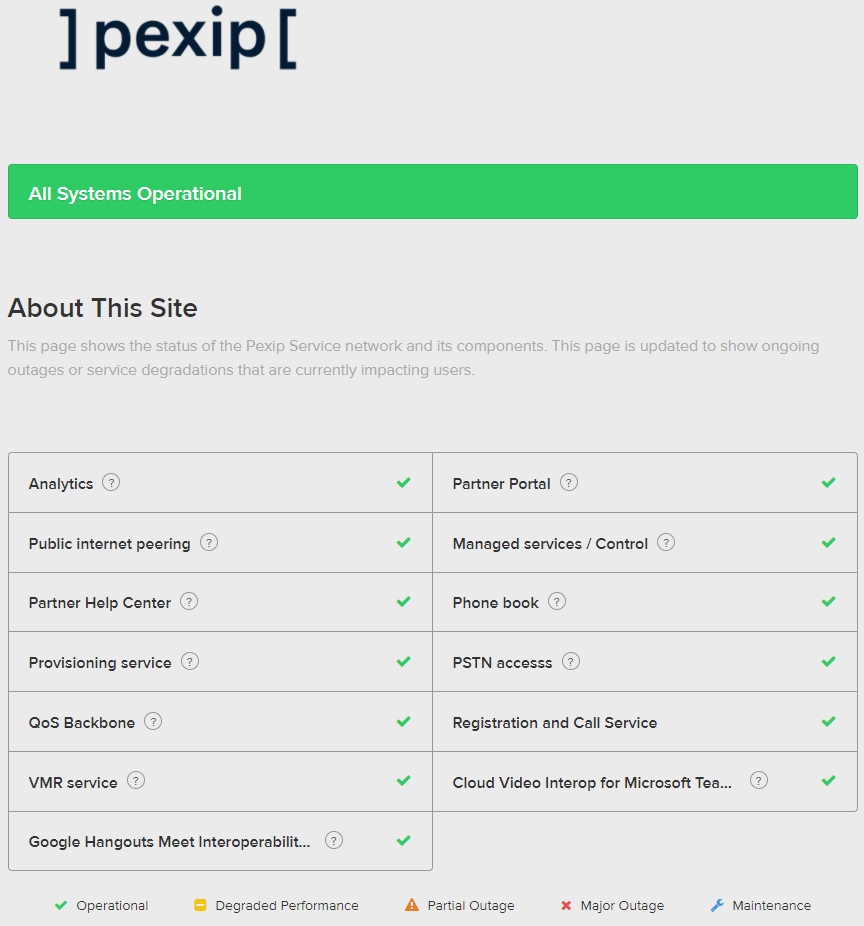 You can view the general status of different services and products on the Pexip Service, and check for scheduled maintenance.