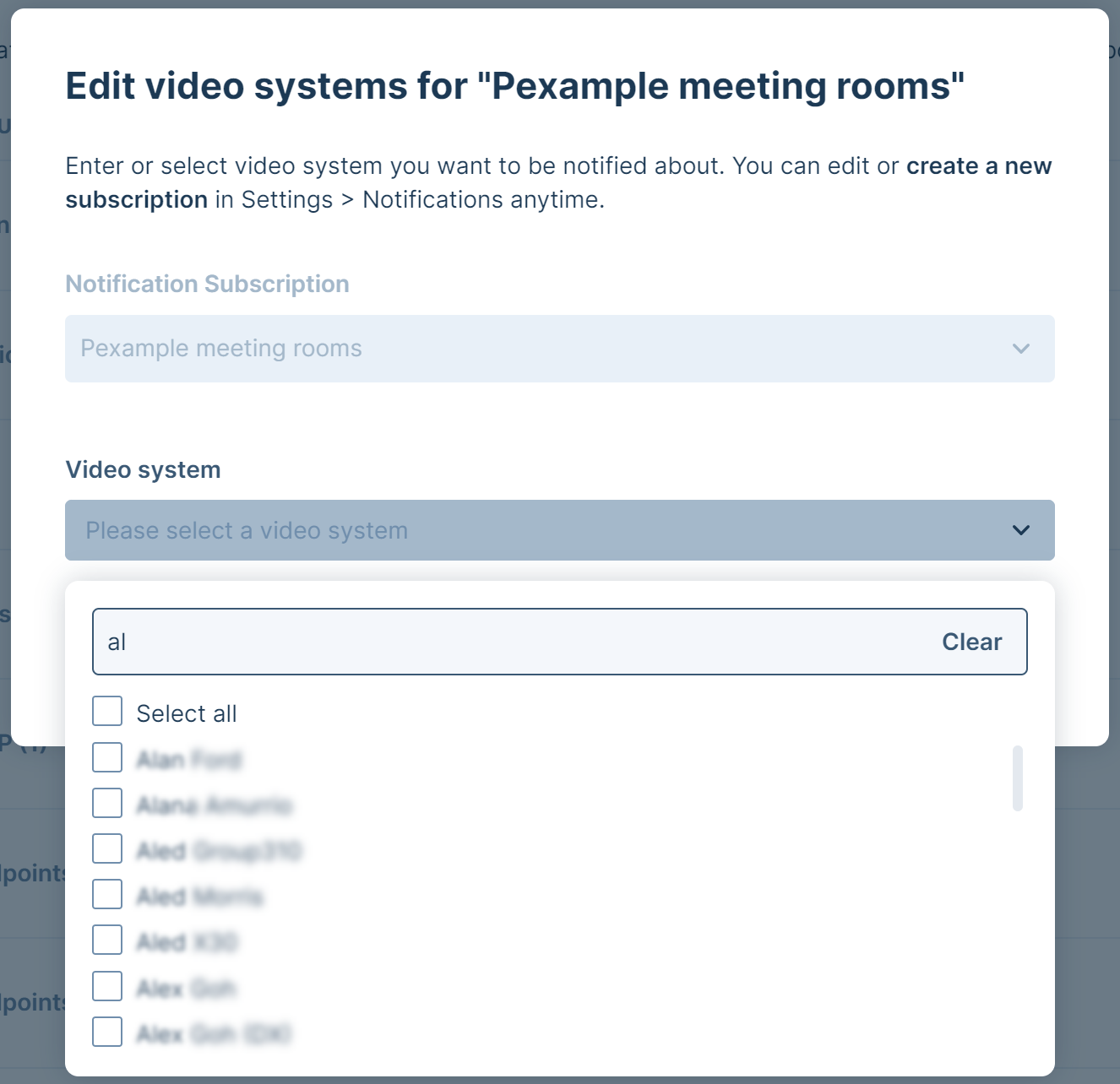 To view all the video systems associated with each subscription, select the subscription. This expands it to show the list of video systems for which notifications will be sent. To hide the list, click on the notification again to collapse it.