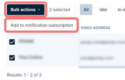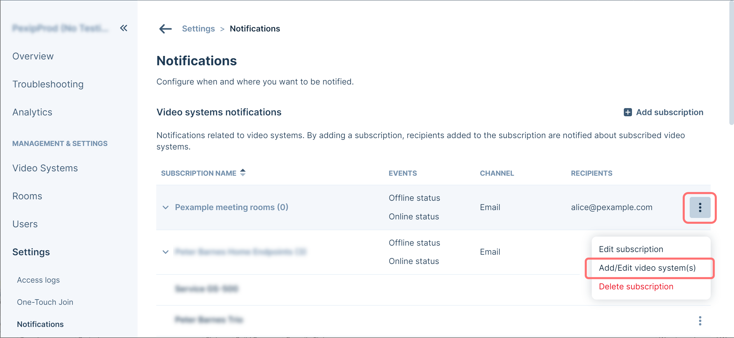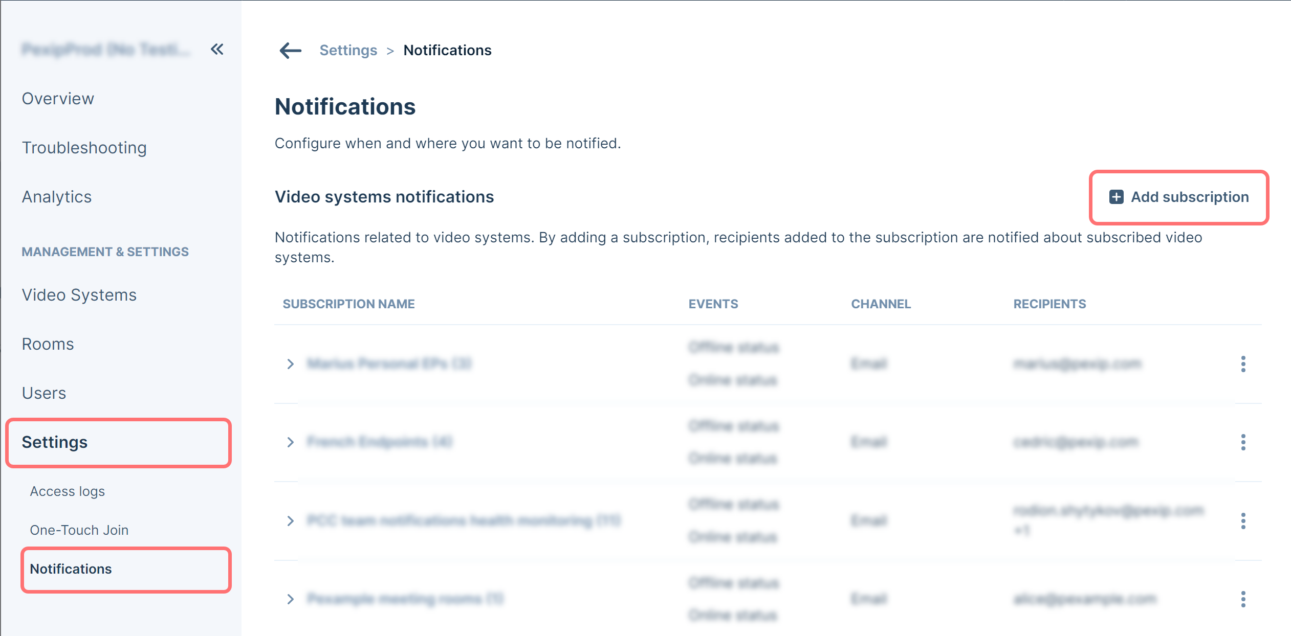 To view the details of a particular subscription, or to change the recipients or video systems associated with it, from the menu on the left, select . This takes you to the Notifications page where you see a list of all subscriptions.