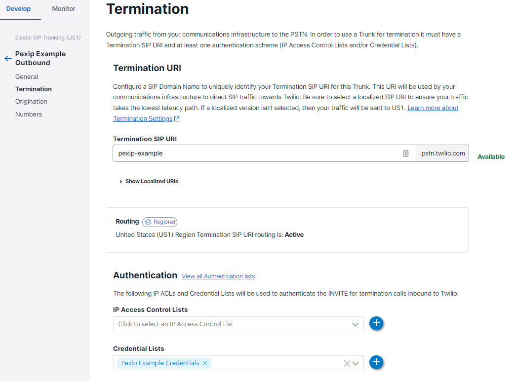 In our example, we enter pexip-example for the SIP URI domain prefix, giving the Termination URI: pexip-example.pstn.twilio.com and select Pexip Example Access Control List and Pexip Example Credentials for authentication.