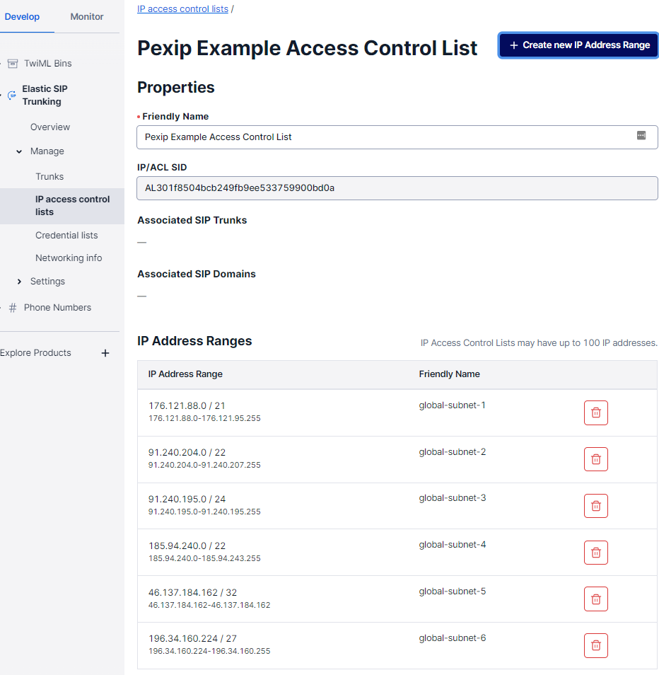 You need to create an IP Access Control List that covers all the Pexip Service IP addresses that may be used to handle your outbound calls to your Twilio SIP trunk. Calls from IP addresses that are not safelisted are declined.