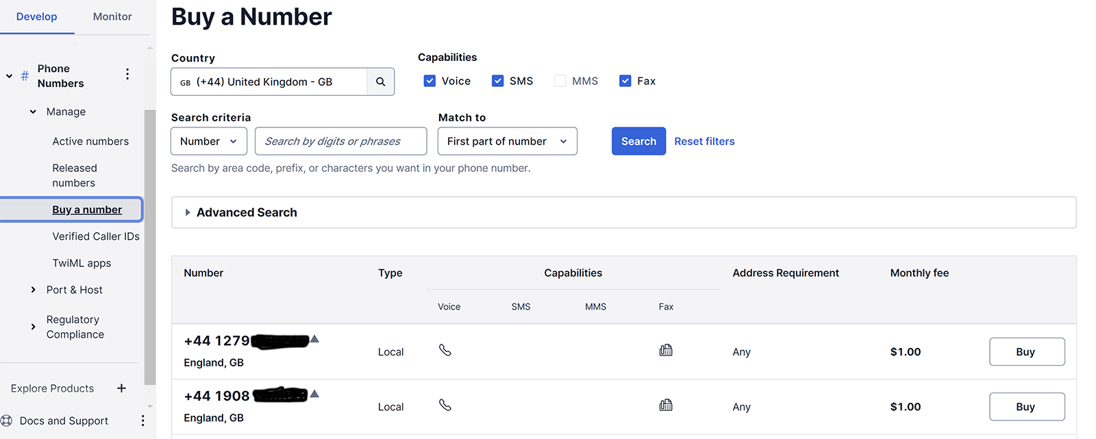 2. A Twilio phone number in the region/country you would like calls to be dialed out from. If you don't already have a suitable number, you can get one from Twilio by going to the Explore Products menu, and then selecting Super Network > Phone Numbers.