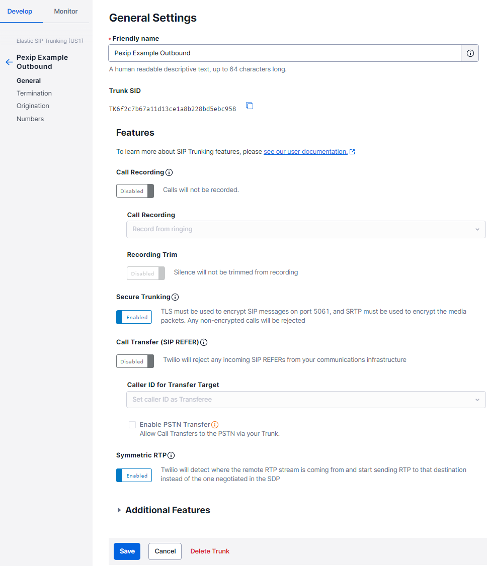 3. Enter a friendly name for your SIP trunk. In our example, we enter Pexip Example Outbound. The settings below have been tested with the Pexip Service.