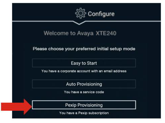 To activate your Avaya video endpoint to the Pexip Service, you need an endpoint subscription and the device needs to be tied to the subscription. Your account manager at your local certified Pexip Partner can help you with this, please contact them first. Then, if you need to initiate provisioning from the device, see the steps below.