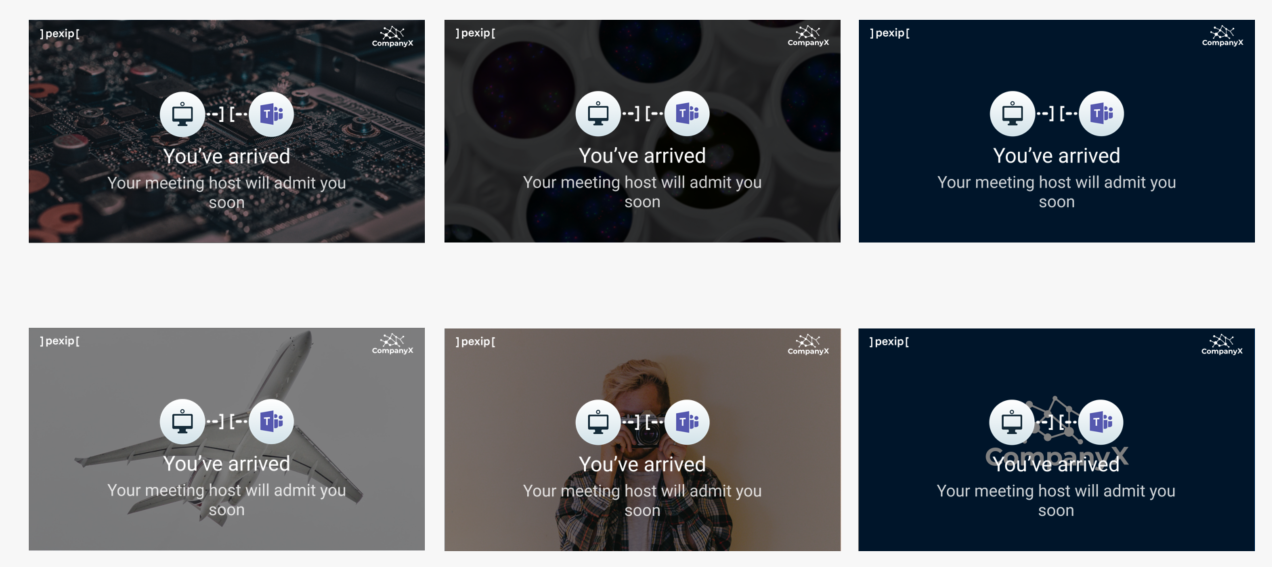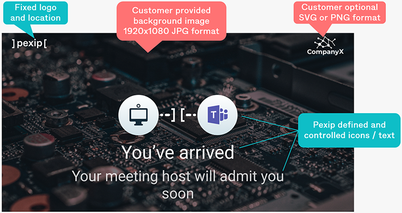 You can supply a specific background picture and your own logo. To optimize the experience Pexip then adds a 50% dark opacity overlay onto your background image to ensure that the service text overlays and icons are visible on top of the background picture.