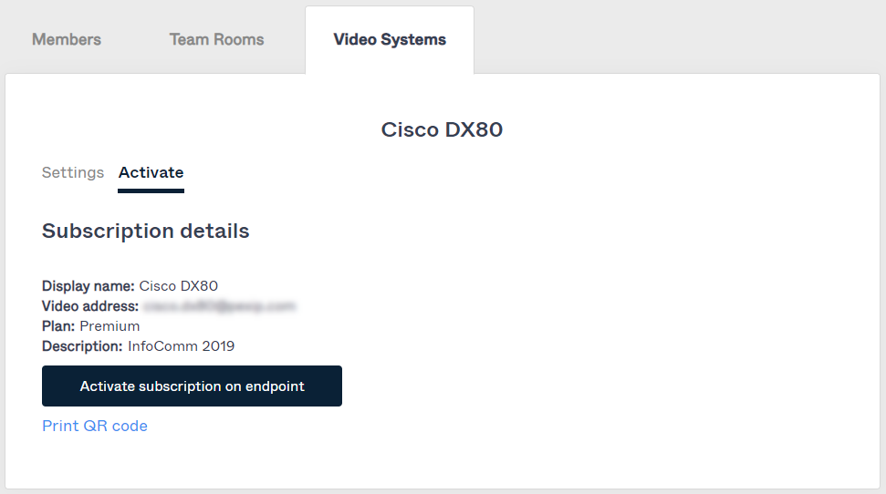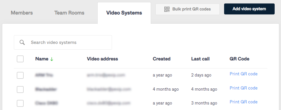 Select the tab to see and modify your existing video systems, and print their associated QR codes. (The other tabs on this page allow you to maintain the members (users) and team rooms within your company.)