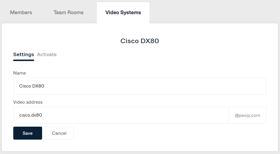 The endpoint's video address e.g. cisco.dx80@companyname.onpexip.com that can be used for calling that endpoint. You can modify the name portion of the address, but you cannot change the domain portion. |