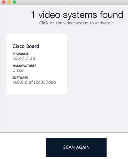 - Select to find your endpoint on the local network. If your computer's firewall prompts you for permission to allow communications for this application, please allow it. When the endpoint scan completes, you see a list of the video systems found. Select the one you want.