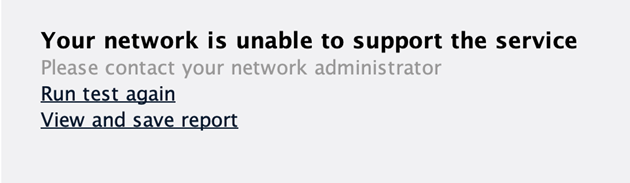 The network test checks the suitability of the network environment for registering your endpoint to the Pexip Service. The test evaluates whether your network supports the Pexip services, verifies that no firewalls will block the service, identifies any issues and explains how to resolve them. You can save the report and forward it to your IT administrator.