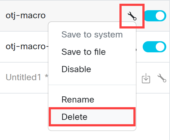 From the list of macros on the left, select the tool icon next to otj-macro and then select Delete: