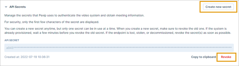 The endpoint communicates using the unique API secret. If the secret is compromised at any point, meetings and information in your organization are vulnerable to compromise. If you think the secret has been compromised, you can revoke the secret at any time. This will prevent OTJ from working on the video system. To ensure that OTJ continues to work, you must: