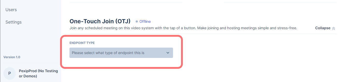 From the bottom of the page expand the One-Touch Join (OTJ) section and from the Endpoint type drop-down, select Cisco: