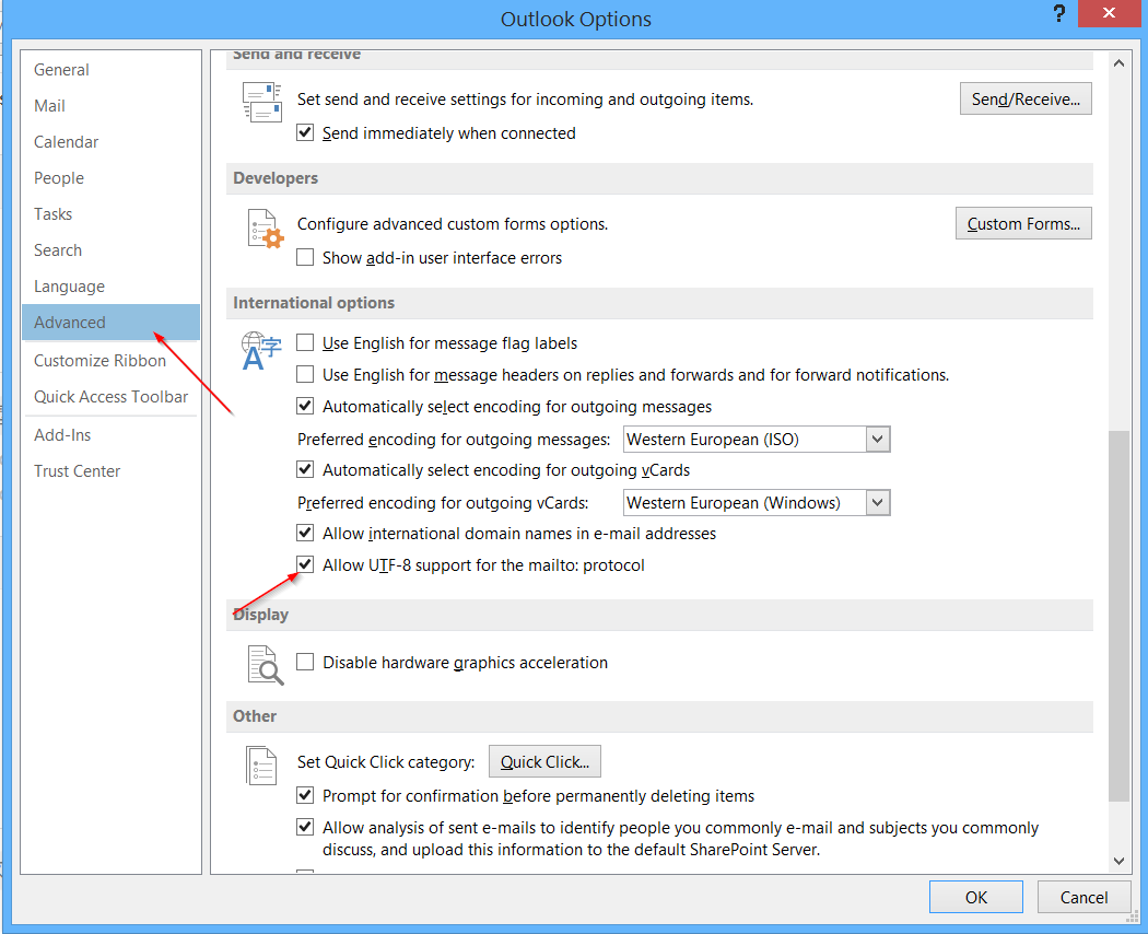 In Outlook, go to File > Options > Advanced and ensure that Allow UTF-8 support in mailto: protocol has been enabled: