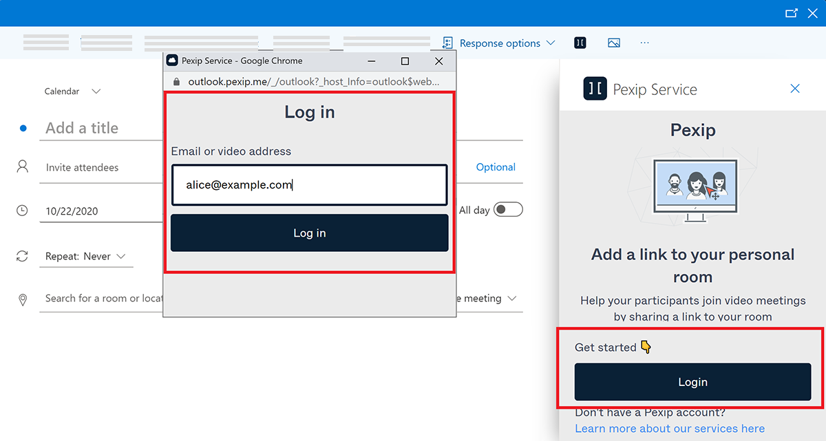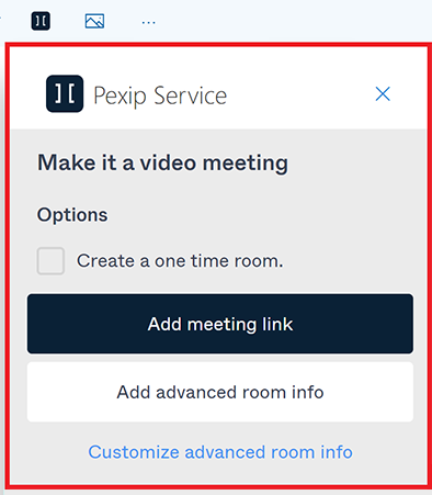 The Pexip Service add-in for Outlook lets you easily add a VMR — either your own, or a one-time-use room — to meetings that you create or edit in your Outlook desktop client.