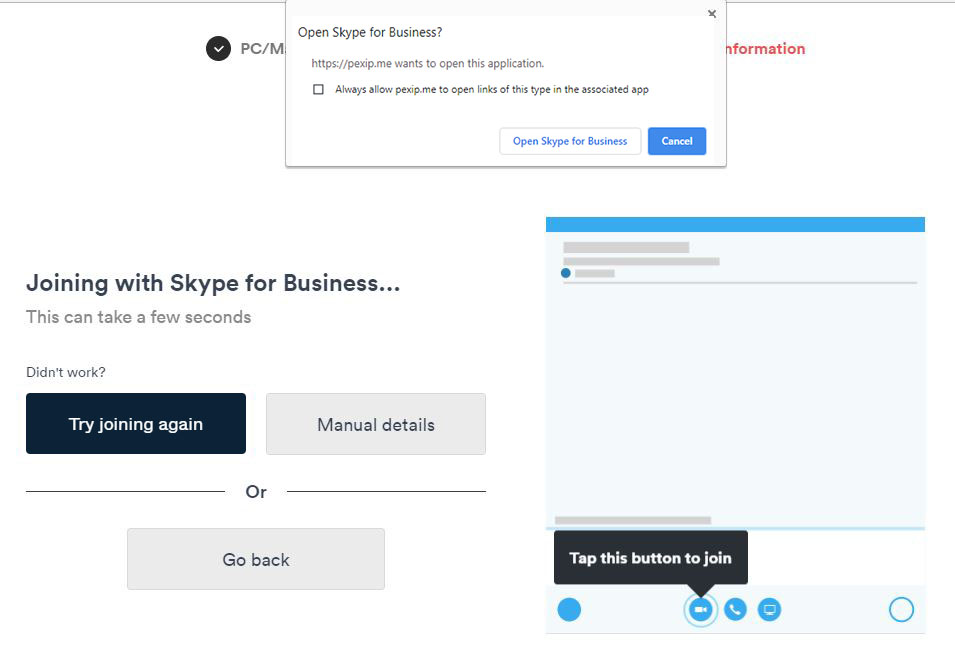 - Typically, you'll have received a meeting link in the style https://pexip.me/meet/<conference_id>. If you follow this link it will first launch the Pexip web app from where you can then join via your Skype for Business client, as described for pexip.me below.