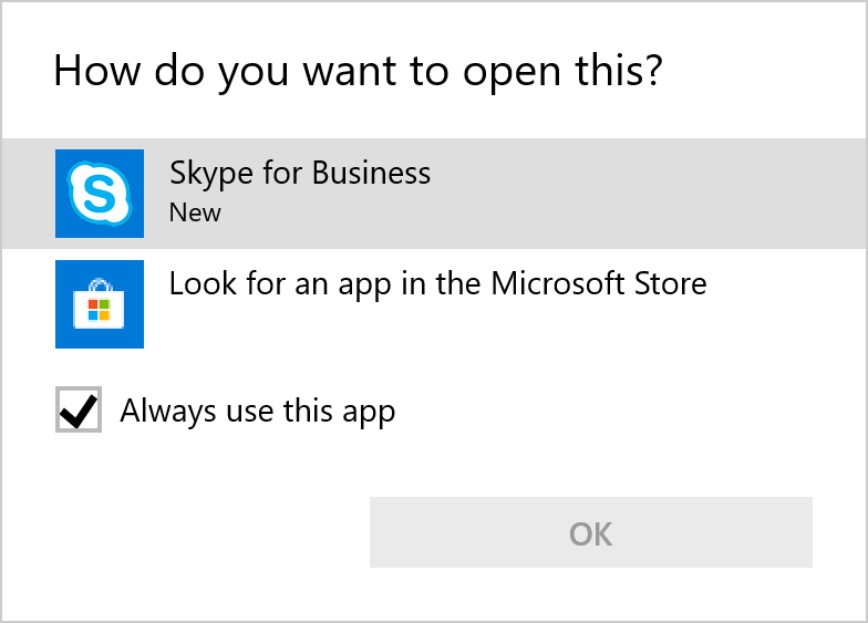 If you select (or if you have previously told your system to always use Skype for Business for these links) then Skype for Business automatically launches: