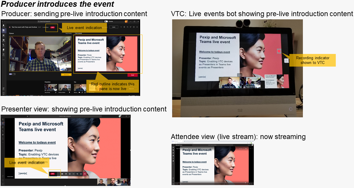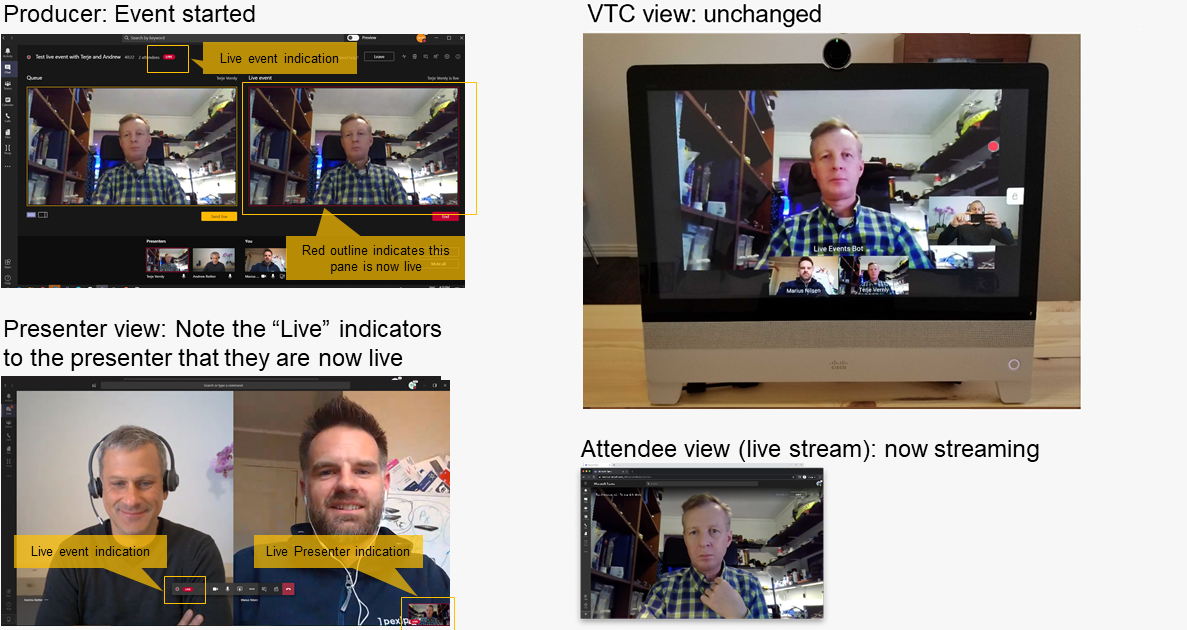 For everyone with a Presenter role, this is just like a Teams Meeting with an additional participant of the “Live events bot”. The “Live events bot” is indicated by the “pre-live” icon on the Teams client and by the “Live” video pane on the VTC system; this video pane shows what is transmitted to the Microsoft Stream backend.