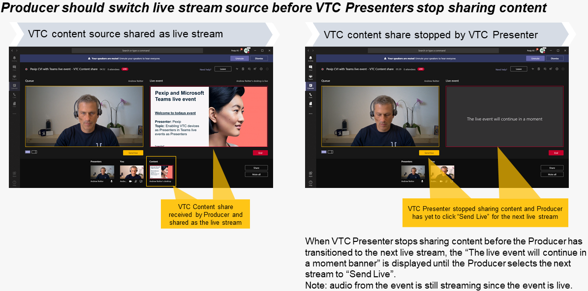 We recommend that VTC Presenter allows the Producer to change the stream source before stopping the VTC based content share.