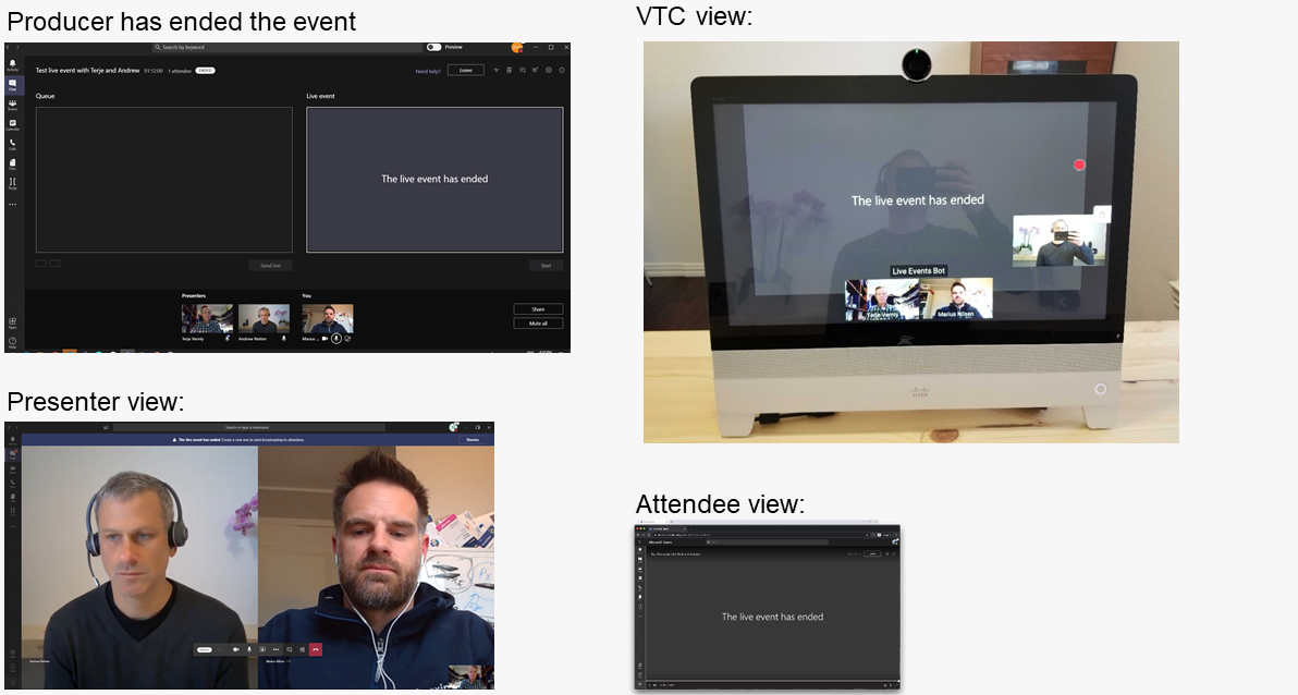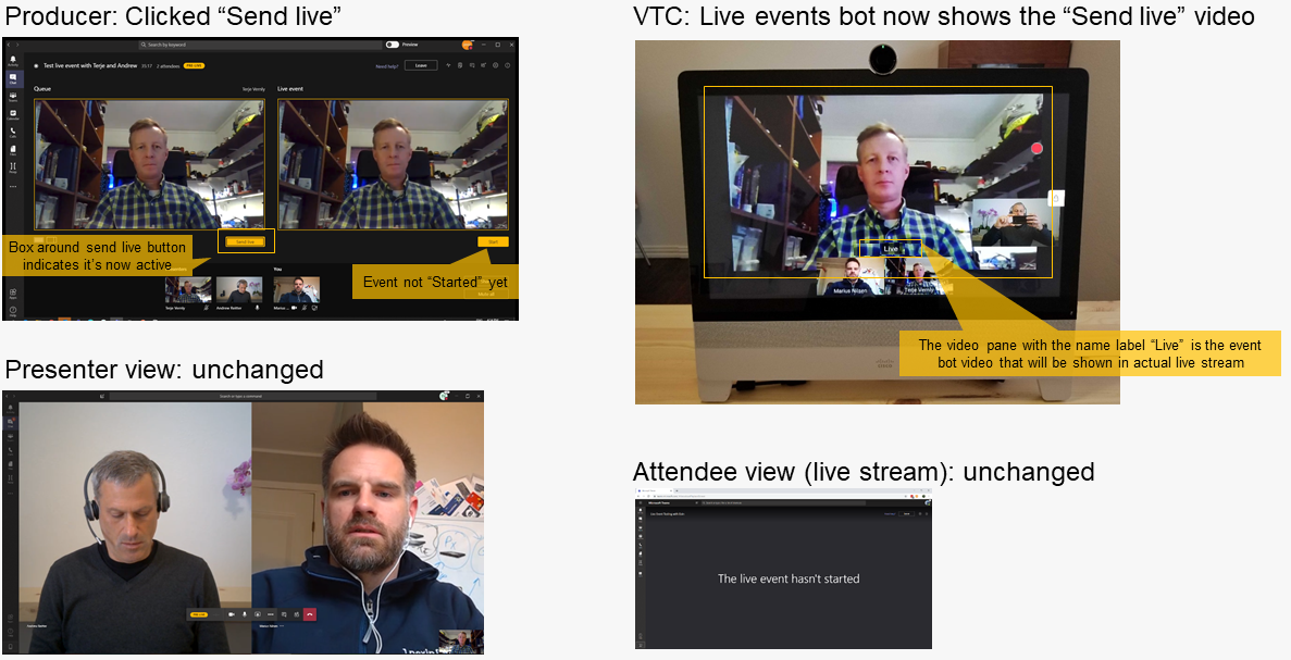 The meeting is still in pre-live mode, but Producer and other Presenters can see the “Send live” video. Note that the Producer and Presenter roles are in a “normal” Teams meeting and that when they speak the video pane switching behavior is the same as a normal meeting. Therefore it is important for everyone to mute their microphones except the active presenter before going live with the event.