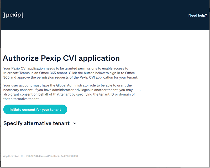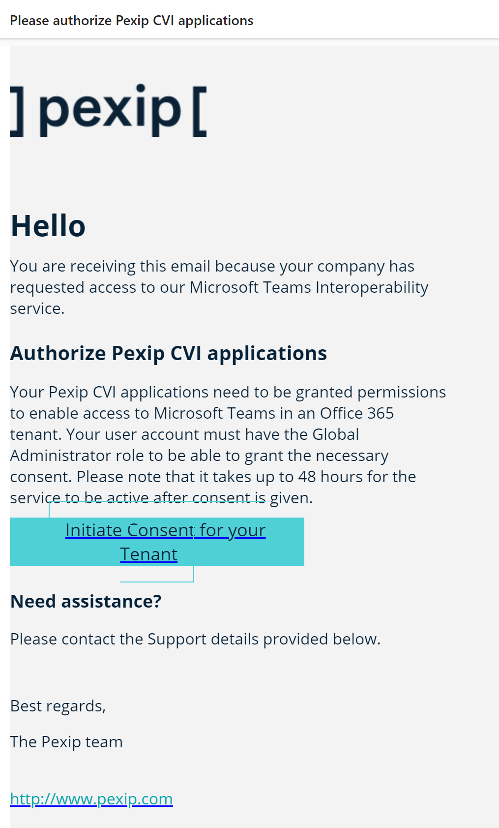 1. After requesting access to the service, you will receive an email asking you to authorize the Pexip CVI application. Click the link Initiate consent for your Tenant link.