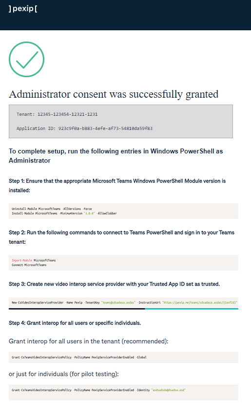 4. A confirmation page verifies that the consent was successfully provided. On this page, you'll also find a PowerShell script and further instructions. Copy and run the script as described on the page.