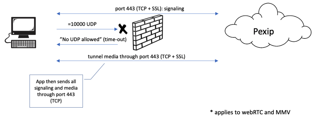 With WebRTC, during the call setup the browser will attempt to send the media using UDP over an ephemeral port (=10,000). However if this port is administratively blocked for web users then the real time media (video and audio) will be forced to tunnel over TCP port 443.